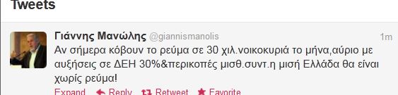 Τις συνέπειες που θα έχουν οι επικείμενες αυξήσεις στα τιμολόγια της ΔΕΗ σχολίασε πριν από λίγο στο Twitter ο Γιάννης Μανώλης.