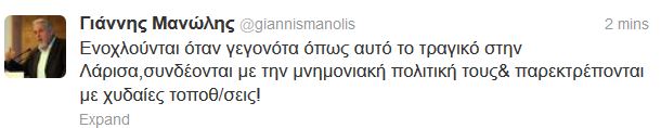 «Ενοχλούνται όταν γεγονότα όπως αυτό το τραγικό στην Λάρισα, συνδέονται με την μνημονιακή πολιτική τους και παρεκτρέπονται με χυδαίες τοποθετήσεις!», έγραψε στο Twitter ο Γιάννης Μανώλης.