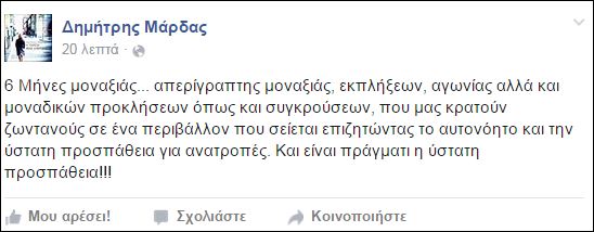 Για ένα εξάμηνο μοναξιάς, εκπλήξεων, αγωνίας, προκλήσεων και συγκρούσεων κάνει λόγο σε ανάρτησή του στο Facebook ο Δημήτρης Μάρδας.