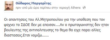 Αιχμές για τον Αλέξη Μητρόπουλου σχετικά με το θέμα που έχει προκύψει με το ΣΔΟΕ, άφησε μέσω του Facebook το μέλος της εκτελεστικής επιτροπής της Δημοκρατικής Αριστεράς Θόδωρος Μαργαρίτης.