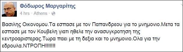 «Βασίλης Οικονόμου .Τα έσπασε με τον Παπανδρέου για το μνημόνιο. Μετά τα έσπασε με τον Κουβέλη γιατί ήθελε την ανασυγκρότηση της κεντροαριστεράς. Τώρα πάει με τη δεξιά και το μνημόνιο. Όλα για την εδρούλα. ΝΤΡΟΠΗ!!!!!!!», έγραψε ο κ. Μαργαρίτης.