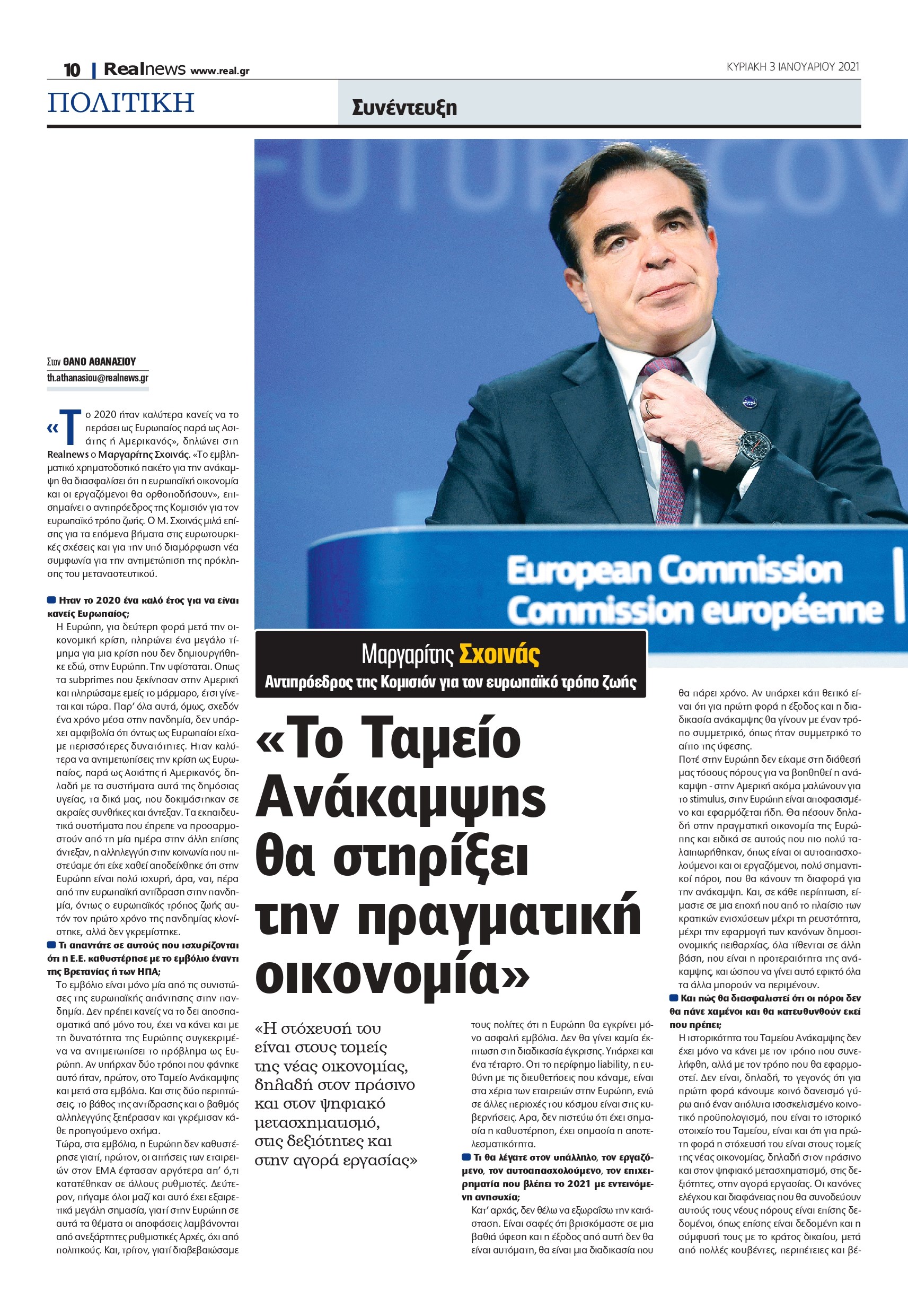 Το 2020 ήταν καλύτερα κανείς να το περάσει ως Ευρωπαίος παρά ως Ασιάτης ή Αμερικανός, δηλώνει στη Realnews ο Μαργαρίτης Σχοινάς. «Το εμβληματικό χρηματοδοτικό πακέτο για την ανάκαμψη θα διασφαλίσει ότι η ευρωπαϊκή οικονομία και οι εργαζόμενοι θα ορθοποδήσουν», επισημαίνει ο αντιπρόεδρος της Κομισιόν για τον ευρωπαϊκό τρόπο ζωής. Ο Μ. Σχοινάς μιλά επίσης για τα επόμενα βήματα στις ευρωτουρκικές σχέσεις και για την υπό διαμόρφωση νέα συμφωνία για την αντιμετώπιση της πρόκλησης του μεταναστευτικού.