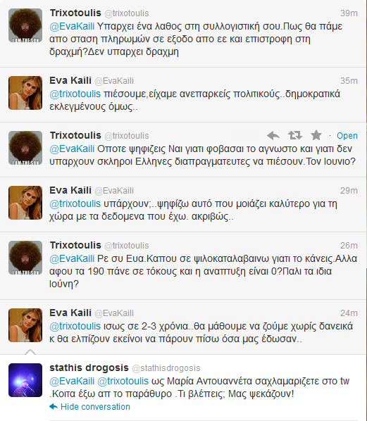 Την ώρα που διεξάγεται η συζήτηση στη Βουλή για την ψήφιση του μνημονίου η βουλευτής του ΠΑΣΟΚ, Εύα Καϊλή έχει ανοίξει …άλλη συζήτηση στο twitter με κάποιον follower, ο οποίος ζητάει να “καταλάβει” τους λόγους για τους οποίους θα ψηφίσει τα νέα μέτρα.Την ίδια ώρα κάποιος “αγανακτισμένος” διαδηλωτής που “βλέπει” τη συζήτηση της γράφει:”Ως Μαρία Αντουαννέτα σαχλαμαρίζετε στο twitter. Κοίτα έξω απ’ το παράθυρο. Τι βλέπεις; Μας ψεκάζουν!” Δείτε τon διάλογο:
