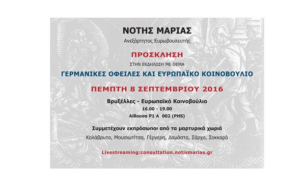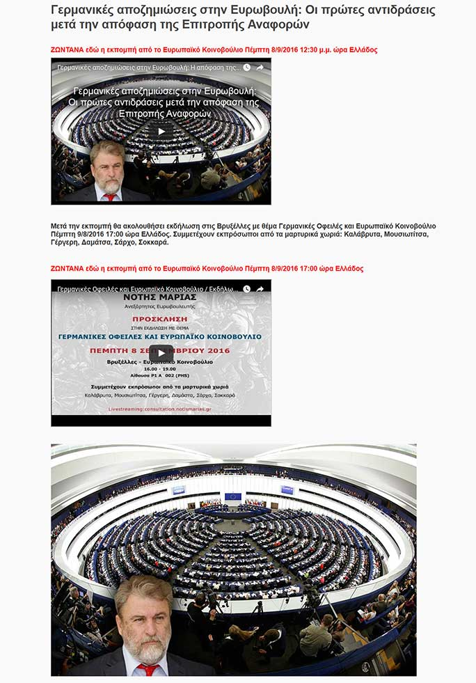 Έτσι την Πέμπτη 8/9 στις 12.30 ώρα Ελλάδος από το Ευρωπαϊκό Κοινοβούλιο στις Βρυξέλλες θα γίνει ραδιοτηλεοπτική εκπομπή με τη συμμετοχή του Νότη Μαριά και εκπροσώπων μαρτυρικών χωριών με συνδέσεις με ραδιοτηλεοπτικούς σταθμούς στην Ελλάδα όπου θα καταγραφούν οι πρώτες αντιδράσεις μετά την Απόφαση των Συντονιστών της Επιτροπής Αναφορών για τις γερμανικές αποζημιώσεις ενώ στις 17.00 ώρα Ελλάδος οι Αντιμνημονιακοί Πολίτες και οι Ευρωπαίοι Αντιφεντεραλιστές διοργανώνουν ειδική εκδήλωση στην Ευρωβουλή με θέμα: Γερμανικές Οφειλές και Ευρωπαϊκό Κοινοβούλιο.