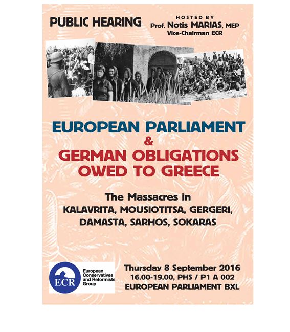 “Στο πλαίσιο αυτό ο Έλληνας Ανεξάρτητος Ευρωβουλευτής προχθές προσκόμισε και νέα στοιχεία και επανέφερε την ως άνω από 27/5/2016 πρότασή του να μείνει ανοικτή η Αναφορά, να κληθούν η Γερμανία και η Ελλάδα να εκφράσουν εγγράφως τις απόψεις τους για τις Γερμανικές Οφειλές και να κληθεί επιπλέον η Ευρωπαϊκή Επιτροπή, η οποία παριστάνει τον Πόντιο Πιλάτο επί του θέματος, να τοποθετηθεί για τις δεσμεύσεις που απορρέουν για την ίδια την ΕΕ από τις αποφάσεις της Διεθνούς Διάσκεψης Ειρήνης των Παρισίων του 1946 για τις Πολεμικές Επανορθώσεις.