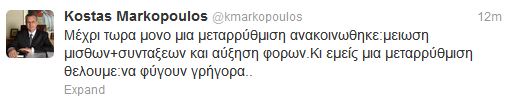 ”Μέχρει τώρα μόνο μία μεταρρύθμιση ανακοινώθηκε: μείωση μισθών και συντάξεων και αύξηση φόρων. Κι εμείς μία μεταρρύθμιση θέλουμε: να φύγουν γρήγορα”, έγραψε στον λογαριασμό του στο twitter ο Κώστας Μαρκόπουλος.
