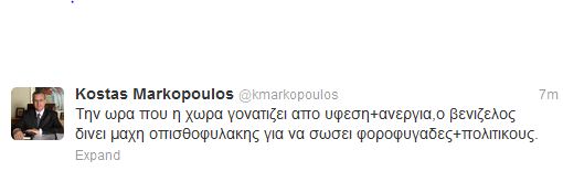 ”Ο Βενιζέλος δίνει μάχη για να σώσει φοροφυγάδες και πολιτικούς”, γράφει στο twitter του ο Κώστας Μαρκόπουλος, σχολιάζοντας όσα είπε ο πρόεδρος του ΠΑΣΟΚ, στην Επιτροπή Θεσμών και Διαφάνειας της Βουλής, για τη λίστα ”Λαγκάρντ”.