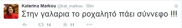 Ένα χιουμοριστικό σχόλιο για την ώρα που διεξάγεται η συζήτηση στην Ολομέλεια της Βουλής και την κούραση των βουλευτών, ανέβασε στον προσωπικό της λογαριασμό στο Twitter, η βουλευτής του Ποταμιού, Κατερίνα Μάρκου.