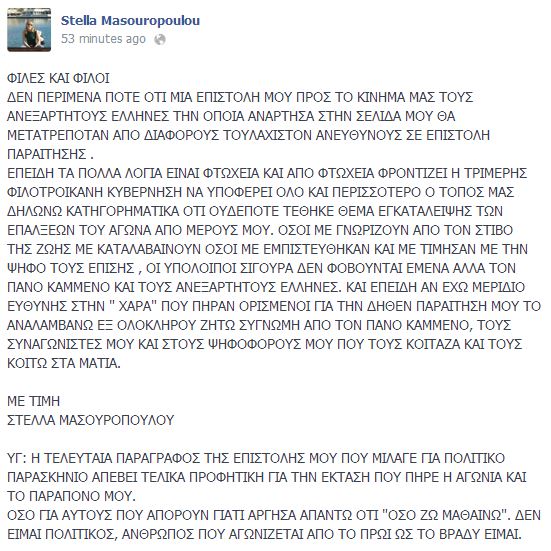 Η υποψήφια βουλευτής Β’ Αθηνών των Ανεξάρτητων Ελλήνων, Στέλλα Μασουροπούλου, ενημέρωσε μέσω του προσωπικού της λογαριασμού στο Facebook, ότι ουδέποτε έχει παραιτηθεί.