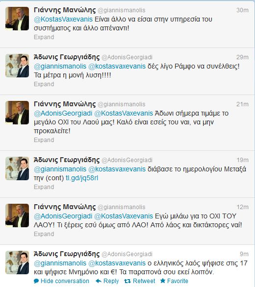 “Μάχη” Γεωργιάδη-Μανώλη Enikos Newsroom 10:22, Κυριακή 28 Οκτωβρίου 2012 πολιτική “Μάχη” Γεωργιάδη-Μανώλη Στα… χαρακώματα του twitter δίνουν πρωί-πρωί τη δική τους… μάχη οι Αδωνις Γεωργιάδης και Γιάννης Μανώλης… TWITTER ΑΔΩΝΙΣ ΓΕΩΡΓΙΑΔΗΣ ΓΙΑΝΝΗΣ ΜΑΝΩΛΗΣ Μοιράσου το: σχολίασε κι εσύ (0 σχόλια) Ακολουθήστε το enikos.gr στο Google News και μάθετε πρώτοι όλες τις ειδήσεις Δείτε όλες τις τελευταίες ειδήσεις από την Ελλάδα και τον Κόσμο στο enikos.gr Ειδήσεις Ροή Ειδήσεων 5 ώρες πριν Η κοινή διακήρυξη Ελλάδας – Κύπρου – Ισραήλ: Ενίσχυση αμυντικής συνεργασίας, δέσμευση για τον Great Sea Inteconnector – Τα μηνύματα της τριμερούς Συνόδου 5 ώρες πριν Αγρότες: Bάζουν στην άκρη τα τρακτέρ ενόψει Χριστουγέννων, θέμα ασφαλείας εγείρει η αστυνομία – Οι αναδιατάξεις που θα γίνουν από την Τρίτη 6 ώρες πριν Νεκρός ο άνδρας που έπεσε στις ράγες του Ηλεκτρικού στα Κάτω Πατήσια 8 ώρες πριν Αλεξανδρούπολη: Μήνυση υπέβαλε ο παππούς του 3χρονου που πέθανε από ασιτία – Αναζητούνται οι δράστες που τον ξυλοκόπησαν 4 ώρες πριν Ολλανδία: Αυτοκίνητο έπεσε σε πλήθος στην πόλη Νούνσπετ – Τουλάχιστον εννέα τραυματίες – ΦΩΤΟ και ΒΙΝΤΕΟ 5 ώρες πριν Το «μαγικό» υλικό της Αρχαιότητας βρίσκεται ακόμα ανάμεσά μας – Η επιστήμη έλυσε το μυστήριο 7 ώρες πριν Αριθμολογία: Η λέξη που σας χαρακτηρίζει, με βάση την ημερομηνία γέννησής σας – «Είναι η αύρα που εκπέμπετε πριν καν μιλήσετε» 6 ώρες πριν Ύπνος: Γιατρός μοιράζεται τα σημάδια που δείχνουν ότι μπορεί να πάσχετε από «ορμονική αϋπνία» 3 ημέρες πριν Enerwave: Το νέο «ρεύμα» στη λιανική ενέργειας που αλλάζει την εμπειρία του καταναλωτή 19 λεπτά πριν Μαδούρο για Τραμπ: «Θα τα πήγαινε καλύτερα αν επικεντρωνόταν στις υποθέσεις της χώρας του» 39 λεπτά πριν Τραγωδία στο Μεξικό: Συνετρίβη αεροσκάφος του Ναυτικού – Τουλάχιστον δύο νεκροί 1 ώρα πριν Τραμπ για Μαδούρο: «Θα ήταν έξυπνο να εγκαταλείψει την εξουσία» – ΒΙΝΤΕΟ 1 ώρα πριν «Είμαστε ένα»: 3.330.000 ευρώ συγκεντρώθηκαν για τα παιδιά στον Χριστουγεννιάτικο Τηλεμαραθώνιο του ΑΝΤ1 2 ώρες πριν Παναμάς: Το δεξαμενόπλοιο που κατασχέθηκε το Σάββατο από αμερικανικές δυνάμεις παραβίαζε τους κανόνες του ναυτικού δικαίου ENIKOS NETWORK Στέλνετε ακόμα Χριστουγεννιάτικες κάρτες; Τι μπορεί να δείχνει για την προσωπικότητά σας Ενεργειακή αναβάθμιση του νοσοκομείου Πατρών «Ο Άγιος Ανδρέας» ΔΕΔΔΗΕ: Τάσεις αποκλιμάκωσης των ρευματοκλοπών αλλά παραμένουν σε υψηλά επίπεδα – Τι δείχνουν τα τελευταία στοιχεία ΥΠΑΑΤ – Ελληνική Αναπτυξιακή Τράπεζα: Συμφωνία για 3 νέα χρηματοδοτικά εργαλεία με μόχλευση πόρων 365 εκατ. ευρώ Ο Google Assistant θα παραμείνει λίγο περισσότερο για ορισμένους χρήστες Android Τεστ προσωπικότητας: Το βάζο που θα επιλέξετε αποκαλύπτει πώς λύνετε προβλήματα στη ζωή σας περισσότερα 22:55 , Δευτέρα 22 Δεκεμβρίου 2025 Τσιάρας: Η κυβέρνηση έχει κάνει τα βήματα που έπρεπε για να βρεθούμε στο τραπέζι της συνεννόησης με τον αγροτικό κόσμο «Η κυβέρνηση έχει κάνει τα βήματα που έπρεπε για να βρεθούμε στο τραπέζι της συνεννόησης με το... 22:31 , Δευτέρα 22 Δεκεμβρίου 2025 Η κοινή διακήρυξη Ελλάδας – Κύπρου – Ισραήλ: Ενίσχυση αμυντικής συνεργασίας, δέσμευση για τον Great Sea Inteconnector – Τα μηνύματα της τριμερούς Συνόδου Σε υπογραφή Κοινής Διακήρυξης προχώρησαν Κυριάκος Μητσοτάκης, Νίκος Χριστοδουλίδης και Μπενιαμ... 21:37 , Δευτέρα 22 Δεκεμβρίου 2025 Θεμιστοκλέους: Ευχαριστώ τον Πρωθυπουργό για τη δυνατότητα να αγωνιστώ για την Ανατολική Αττική «Αξία στη ζωή έχει ν