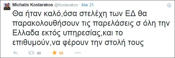 Ωστόσο τα «τιτιβίσματα» του στρατηγού, Μ. Κωσταράκου, δεν σταμάτησαν εκεί. Επανήλθε με νέες αναρτήσεις εκφράζοντας την ικανοποίησή του για την τελική πρόβα των τμημάτων που θα παρελάσουν («είναι εξαιρετικό. Έπεσε σκληρή δουλειά. Μπράβο παιδιά»), ενώ με άλλο tweet προτρέπει «όσα στελέχη των ΕΔ θα παρακολουθήσουν τις παρελάσεις σε όλη την Ελλάδα εκτός υπηρεσίας, και το επιθυμούν, να φέρουν τη στολή τους».