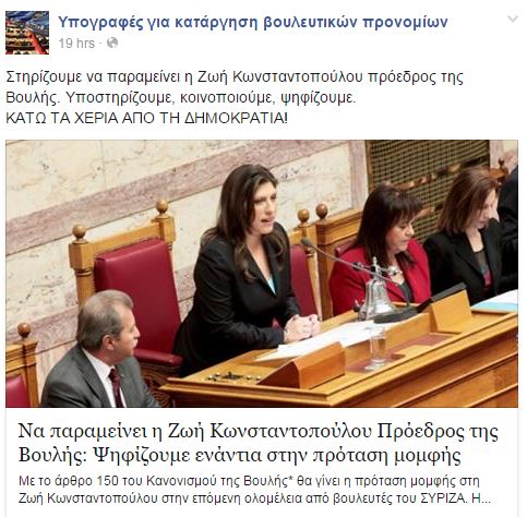 Την υποστήριξή τους στην Ζωή Κωνσταντοπούλου εκφράζουν χρήστες του Facebook και μαζεύουν υπογραφές προκειμένου να παραμείνει στην Προεδρία της Βουλής.