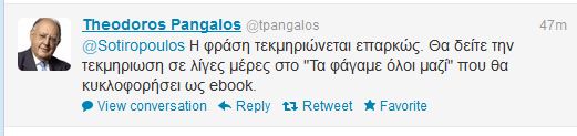 “Ήταν ατεκμηρίωτη η δήλωση;”, ρώτησε ένας συνομιλητής του στο Twitter τον Θεόδωρο Πάγκαλο, αναφερόμενος στη γνωστή φράση που είχε πεί “Τα φάγαμε όλοι μαζί”, η οποία θα αποτελέσει και τον τίτλο του βιβλίου που συγγράφει αυτό το διάστημα. “Εκ των υστέρων αναζήτηση στοιχείων; Ήταν ατεκμηρίωτη η δήλωση;”, ρώτησαν τον Θεόδωρο Πάγκαλο, ο οποίος έχει απευθύνει κάλεσμα στον κόσμο να του στέλνει τις ιστορίες τους που να τεκμηριώνουν τη φράση “τα φάγαμε όλοι μαζί” προκειμένου να τις συμπεριλάβει στο βιβλίο του. “Η φράση τεκμηριώνεται επαρκώς. Θα δείτε την τεκμηριωση σε λίγες μέρες στο “Τα φάγαμε όλοι μαζί” που θα κυκλοφορήσει ως ebook.