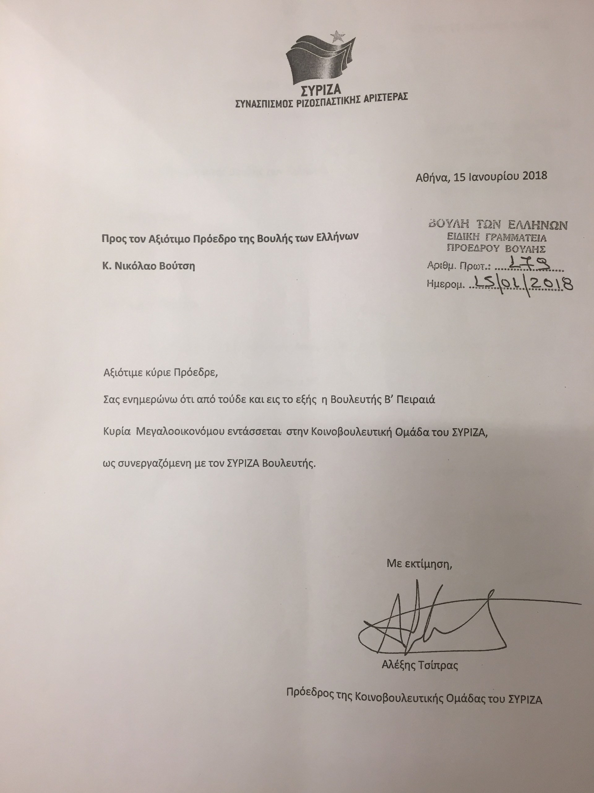 Την ανακοίνωση έκανε η αντιπρόεδρος της Βουλής Τασία Χριστοδουλοπούλου, που ανέγνωσε αρχικά την επιστολή της βουλευτή Β’ Πειραιά, στην οποία εκφράζει τη βούλησή της να προσχωρήσει ως συνεργαζόμενη στην Κ.Ο. του ΣΥΡΙΖΑ . Στη συνέχεια διάβασε την επιστολή του Πρωθυπουργού και προέδρου της Κ.Ο. του ΣΥΡΙΖΑ Αλέξη Τσίπρα προς τον Πρόεδρο της Βουλής, που αναφέρει “ότι από τούδε και στο εξής η βουλευτής Β’ Πειραιά Θεοδώρα Μεγαλοοικονόμου εντάσσεται στην Κ.Ο ΣΥΡΙΖΑ ως συνεργαζόμενη με τον ΣΥΡΙΖΑ βουλευτής”.