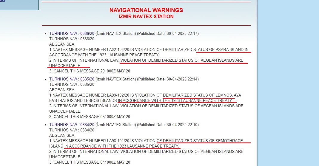 Έτσι η Τουρκία με 3 NAVTEX, που εξέδωσε η υδρογραφική υπηρεσία Σμύρνης, απαγορεύει στο Πολεμικό Ναυτικό της Ελλάδας να πραγματοποιήσεις ασκήσεις στα νησιά Σαμοθράκης, Λήμνο, Άγιο Ευστράτιο, Λέσβο και Ψαρά, τα οποία λέει ότι πρέπει να αποστρατιωτικοποιηθούν, επικαλούμενη μάλιστα την Συνθήκη της Λωζάνης.