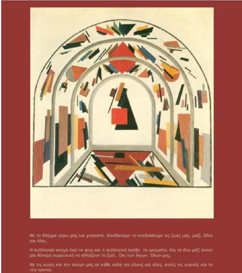 Το ευχετήριο κείμενο αναφέρει «Με το βλέμμα γύρω μας και μπροστά μας, διεκδικούμε να σχεδιάσουμε τις ζωές μας, μαζί. Όλοι και όλες. Η συλλογική σκέψη έχει το φως και η συλλογική πράξη τα χρώματα. Και οι δύο μαζί έχουν μια δύναμη σωρευτική να αλλάζουν την ζωή. Όχι των λίγων. Όλων μας. Με τις ευχές και την σκέψη μας σε κάθε καλό για όλους και όλες, αυτές τις γιορτές και τη νέα χρονιά».