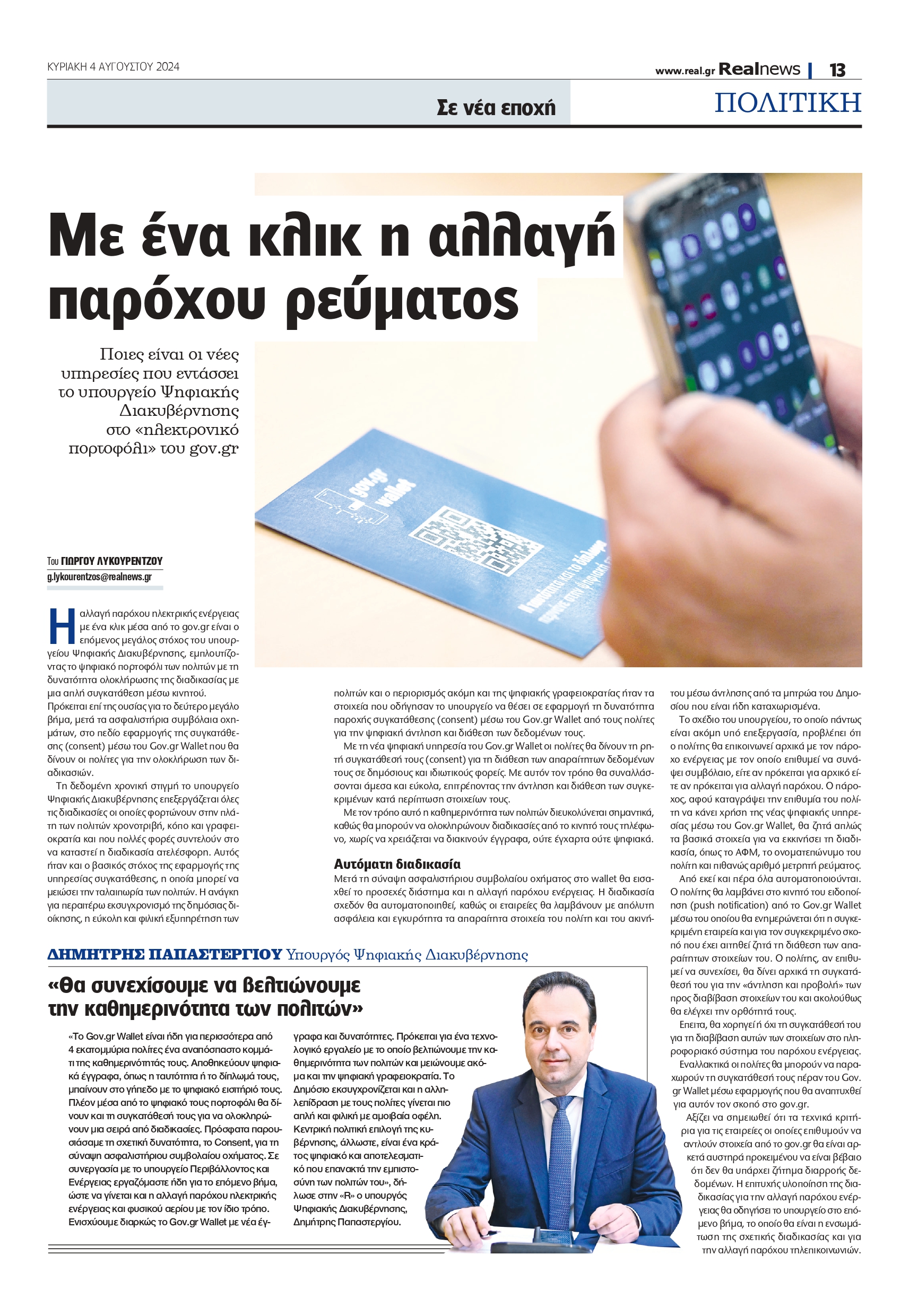 «Το Gov.gr Wallet είναι ήδη για περισσότερα από 4 εκατομμύρια πολίτες ένα αναπόσπαστο κομμάτι της καθημερινότητάς τους. Αποθηκεύουν ψηφιακά έγγραφα, όπως η ταυτότητα ή το δίπλωμά τους, μπαίνουν στο γήπεδο με το ψηφιακό εισιτήριό τους. Πλέον μέσα από το ψηφιακό τους πορτοφόλι θα δίνουν και τη συγκατάθεσή τους για να ολοκληρώνουν μια σειρά από διαδικασίες. Πρόσφατα παρουσιάσαμε τη σχετική δυνατότητα, το Consent, για τη σύναψη ασφαλιστήριου συμβολαίου οχήματος. Σε συνεργασία με το υπουργείο Περιβάλλοντος και Ενέργειας εργαζόμαστε ήδη για το επόμενο βήμα, ώστε να γίνεται και η αλλαγή παρόχου ηλεκτρικής ενέργειας και φυσικού αερίου με τον ίδιο τρόπο. Ενισχύουμε διαρκώς το Gov.gr Wallet με νέα έγγραφα και δυνατότητες. Πρόκειται για ένα τεχνολογικό εργαλείο με το οποίο βελτιώνουμε την καθημερινότητα των πολιτών και μειώνουμε ακόμα και την ψηφιακή γραφειοκρατία. Το Δημόσιο εκσυγχρονίζεται και η αλληλεπίδραση με τους πολίτες γίνεται πιο απλή και φιλική με αμοιβαία οφέλη. Κεντρική πολιτική επιλογή της κυβέρνησης, άλλωστε, είναι ένα κράτος ψηφιακό και αποτελεσματικό που επανακτά την εμπιστοσύνη των πολιτών του», δήλωσε στην «R» ο υπουργός Ψηφιακής Διακυβέρνησης, Δημήτρης Παπαστεργίου.