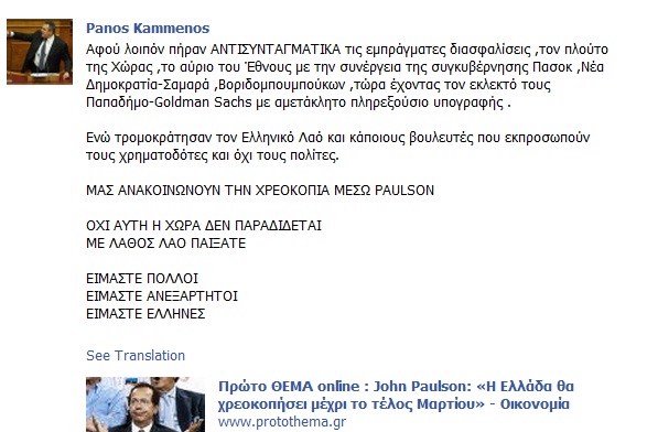 Καυτός, ως συνήθως, Πάνος Καμμένος στο facebook. Ο ανεξάρτητος βουλευτής έγραψε το πρωί της Πέμπτης:«Αφού λοιπόν πήραν ΑΝΤΙΣΥΝΤΑΓΜΑΤΙΚΑ τις εμπράγματες διασφαλίσεις, τον πλούτο της Χώρας, το αύριο του Έθνους με την συνέργεια της συγκυβέρνησης Πασοκ, Νέα Δημοκρατία-Σαμαρά, Βοριδομπουμπούκων, τώρα έχοντας τον εκλεκτό τους Παπαδήμο-Goldman Sachs με αμετάκλητο πληρεξούσιο υπογραφής .Ενώ τρομοκράτησαν τον Ελληνικό Λαό και κάποιους βουλευτές που εκπροσωπούν τους χρηματοδότες και όχι τους πολίτες.ΜΑΣ ΑΝΑΚΟΙΝΩΝΟΥΝ ΤΗΝ ΧΡΕΟΚΟΠΙΑ ΜΕΣΩ PAULSONΟΧΙ ΑΥΤΗ Η ΧΩΡΑ ΔΕΝ ΠΑΡΑΔΙΔΕΤΑΙ