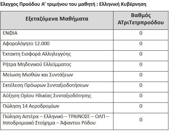 «Στην πρόοδο των μαθημάτων όπως μας τα επέβαλαν, πρέπει να πάρουμε μηδέν», τόνισε χαρακτηριστικά ο βουλευτής του ΣΥΡΙΖΑ, ενώ με ανακοίνωση του δίνει αναλυτικά την βαθμολογία σε κάθε “μάθημα”.