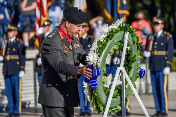 Κατά την τελευταία ημέρα της επίσκεψής του στην Αμερική, ο Αρχηγός ΓΕΣ, με τον Αμερικανό ομόλογό του πραγματοποίησαν με το 3ο Σύνταγμα Πεζικού των ΗΠΑ υπό των εμβατηρίων της Μπάντας του Στρατού, κατάθεση στεφάνου στο Μνημείο του Αγνώστου Στρατιώτη, στο Εθνικό Κοιμητήριο του Άρλιγκτον.