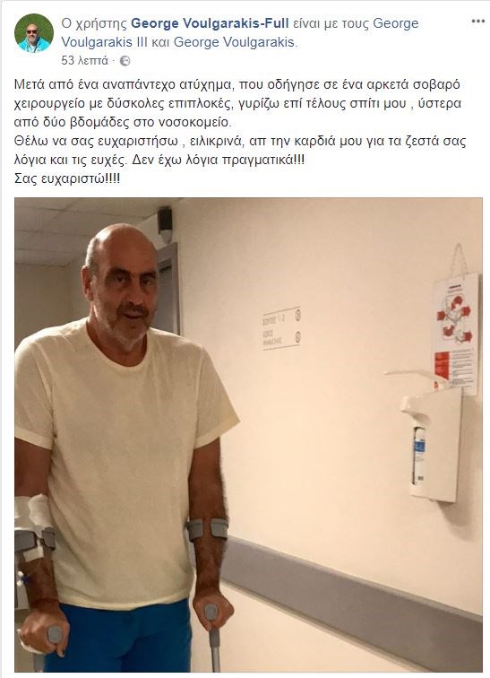 “Μετά από ένα αναπάντεχο ατύχημα, που οδήγησε σε ένα αρκετά σοβαρό χειρουργείο με δύσκολες επιπλοκές, γυρίζω επί τέλους σπίτι μου , ύστερα από δύο βδομάδες στο νοσοκομείο.
