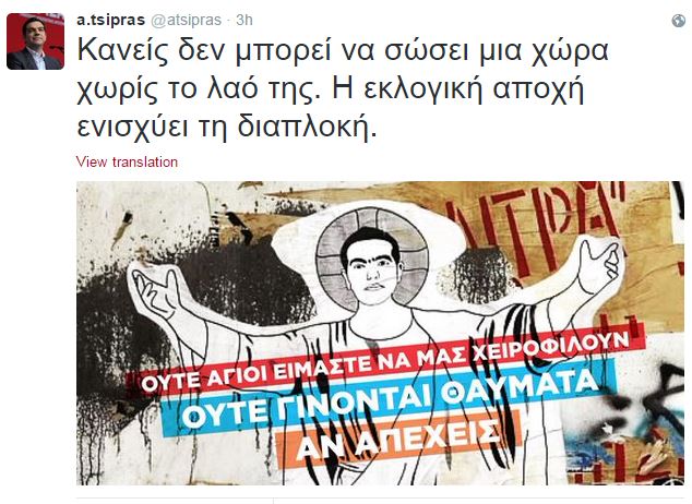 Κανείς δεν μπορεί να σώσει μια χώρα χωρίς το λαό της. Η εκλογική αποχή ενισχύει τη διαπλοκή», γράφει ο κ. Τσίπρας ανεβάζοντας μια φωτογραφία που απεικονίζει τον Χριστό με τη μορφή του Αλέξη Τσίπρα.