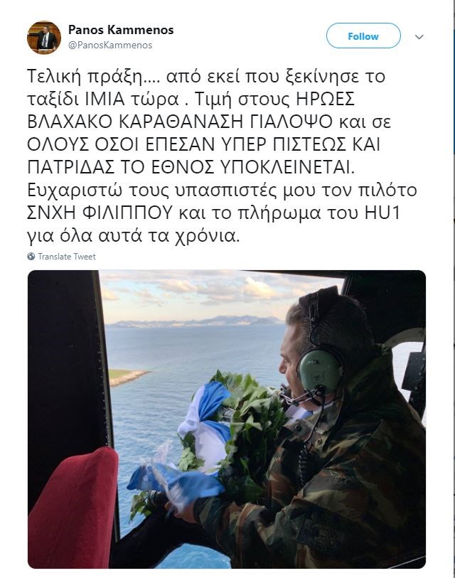 Ο απερχόμενος υπουργός Εθνικής Άμυνας πέταξε με ελικόπτερο πάνω από τα Ίμια κι έριξε στεφάνι στη θάλασσα προς τιμήν των ηρώων Παναγιώτη Βλαχάκου, Χριστόδουλου Καραθανάση και Έκτορα Γιαλοψού που έχασαν τη ζωή τους κατά την κρίση των Ιμίων αλλά και όλων όσοι έπεσαν υπέρ πίστεως και πατρίδας.