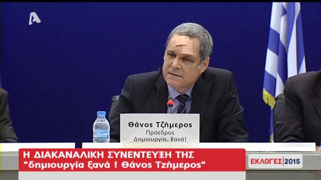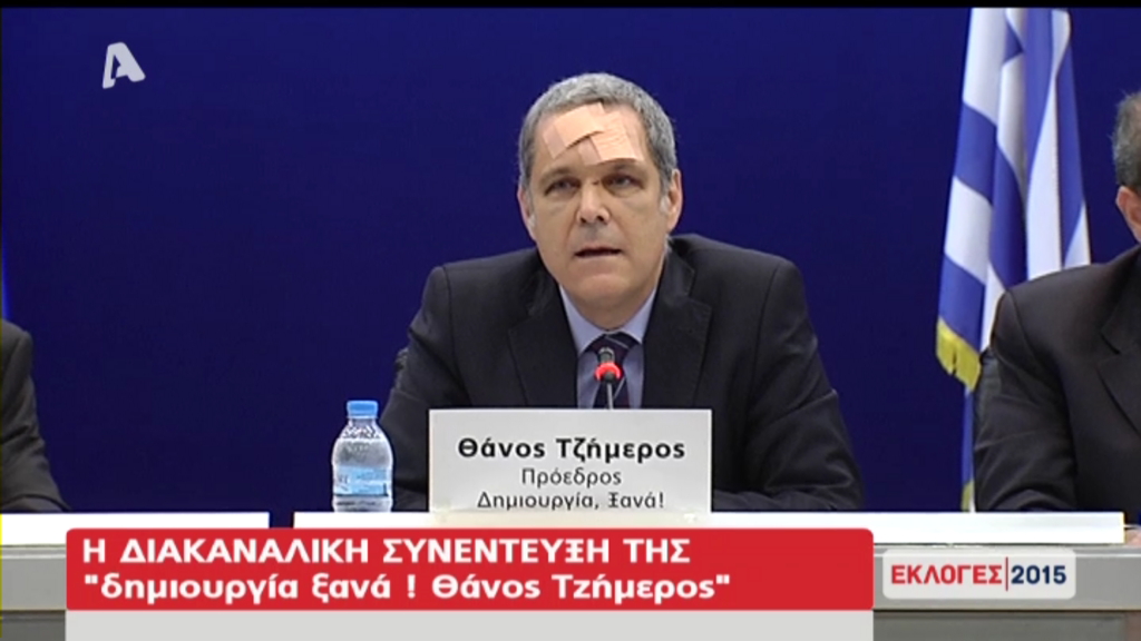 Ο επικεφαλής της Δημιουργίας Ξανά, Θάνος Τζήμερος, εμφανίστηκε στη διακαναλική συνέντευξη του κόμματος με τσιρότα στο μέτωπο από το πρόσφατο τροχαίο ατύχημα που είχε στον Βόλο.