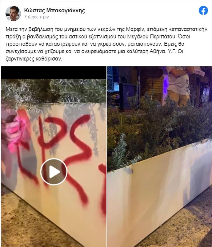 Τις ζημιές που προκλήθηκαν στις ζαρντινιέρες του Μεγάλου Περιπάτου, όταν άγνωστοι τις γέμισαν με συνθήματα σχολίασε ο Κώστας Μπακογιάννης.