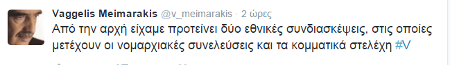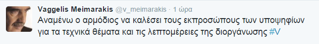 Συγκεκριμένα ο κ. Μεϊμαράκης, έγραψε στο Twitter: «Από την αρχή είχαμε προτείνει δύο εθνικές συνδιασκέψεις, στις οποίες μετέχουν οι νομαρχιακές συνελεύσεις και τα κομματικά στελέχη», ενώ στη συνέχεια με δεύτερη ανάρτηση πρόσθεσε: «Αναμένω ο αρμόδιος να καλέσει τους εκπροσώπους των υποψηφίων για τα τεχνικά θέματα και τις λεπτομέρειες της διοργάνωσης».