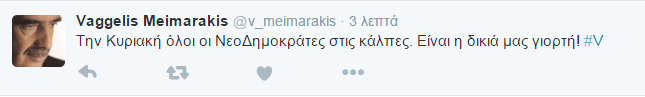 Ο Βαγγέλης Μεϊμαράκης, με ανάρτηση του στο Twitter κάλεσε τους φίλους του κόμματος να πάνε την Κυριακή να ψηφίσουν για την ανάδειξη του Προέδρου της Νέας Δημοκρατίας και πρόσθεσε: «Είναι η δικιά μας γιορτή».