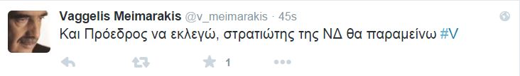 «Και Πρόεδρος να εκλεγώ, στρατιώτης της ΝΔ θα παραμείνω» έγραψε ο Βαγγέλης Μεϊμαράκης στον λογαριασμό του στο Twitter.
