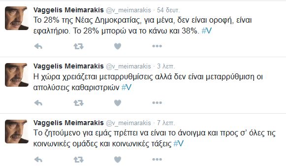 Στο μήνυμά του ο κ.Μειμαράκης: «Το 28% της Νέας Δημοκρατίας, για μένα, δεν είναι οροφή, είναι εφαλτήριο. Το 28% μπορώ να το κάνω και 38%. H χώρα χρειάζεται μεταρρυθμίσεις, αλλά δεν είναι μεταρρύθμιση οι απολύσεις καθαριστριών.