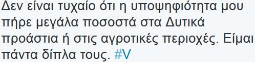 «Δεν είναι τυχαίο ότι η υποψηφιότητα μου πήρε μεγάλα ποσοστά στα Δυτικά προάστια ή στις αγροτικές περιοχές. Είμαι πάντα δίπλα τους».