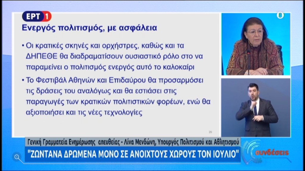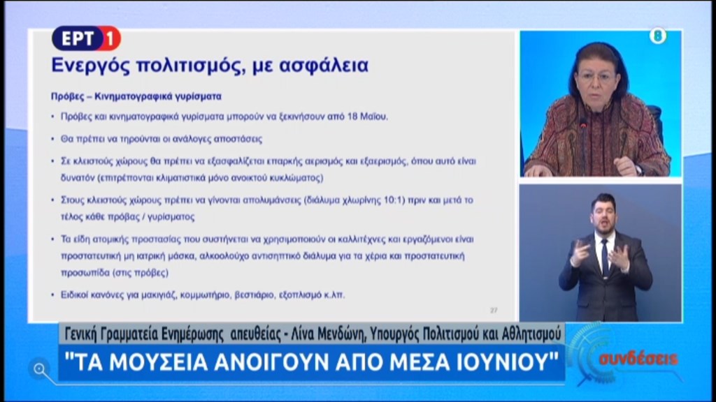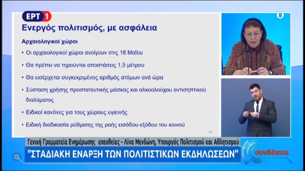 Συνέχισε λέγοντας πως η Ελλάδα είναι από τις πρώτες χώρες που ενεργοποιούν την επανέναρξη του πολιτισμού. “Θέλουμε ενεργό πολιτισμό με ασφάλεια” επεσήμανε. Σχετικά με το χρονοδιάγραμμα λειτουργίας χώρων η κυρία Μενδώνη είπε πως από 18 Μαΐου ανοίγουν αρχαιολογικοί χώροι κλπ. με μέτρα ασφαλείας, περιορισμένο αριθμό προσερχομένων, κανόνες υγιεινής κλπ. Έως 18 Μαΐου θα έχουν εκδοθεί τα πρωτόκολλα ασφαλείας. Τα μουσεία θα ανοίξουν από τις 15 Ιουνίου με παρόμοιους κανόνες ενώ οι πρόβες και τα κινηματογραφικά γυρίσματα μπορούν να ξεκινήσουν από 18 Μαΐου, με ειδικούς κανόνες, μέτρα υγιεινής, μακιγιάζ, κομμωτήρια κλπ. Θα υπάρξουν ειδικές εγκύκλιοι με οδηγίες.