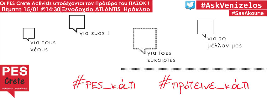 “Την Πέμπτη 15/01 και ώρα 14.30 οι ακτιβιστές Κρήτης του Ευρωπαϊκού Σοσιαλιστικού Κόμματος υποδέχονται στο Ξενοδοχείο Atlantis στο Ηράκλειο τον Πρόεδρο του ΠΑΣΟΚ Ευάγγελο Βενιζέλο και καλούν τους νέους της πόλης να συμμετέχουν σε ένα ελεύθερο διάλογο μαζί του για τα προβλήματα που αντιμετωπίζει η νέα γενιά, αλλά και για τις ιδέες και τις προτάσεις του για την επόμενη μέρα της χώρας και της Ευρωπαϊκής Ένωσης ! Πίνουμε καφέ, συζητάμε ελεύθερα για τους Νέους, για δίκαιες ευκαιρίες, για το Μέλλον μας για τη Δημοκρατία και την Οικονομία, μεταφέρουμε τους προβληματισμούς μας και φέρνουμε κοντά τον πολίτη με τα κεντρικά όργανα παραγωγής πολιτικής !