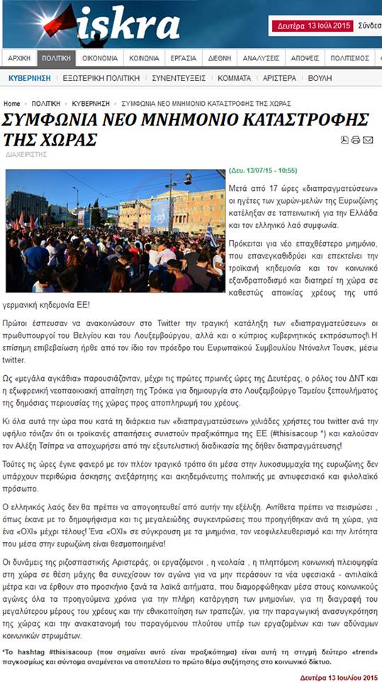 Η ιστοσελίδα της Αριστερής Πλατφόρμας, iskra.gr έπεσε λίγη ώρα μετά τη δημοσίευση του άρθρου για τη συμφωνία της κυβέρνησης με τους δανειστές, υπό τον τίτλο «Συμφωνία νέο μνημόνιο καταστροφής της χώρας».