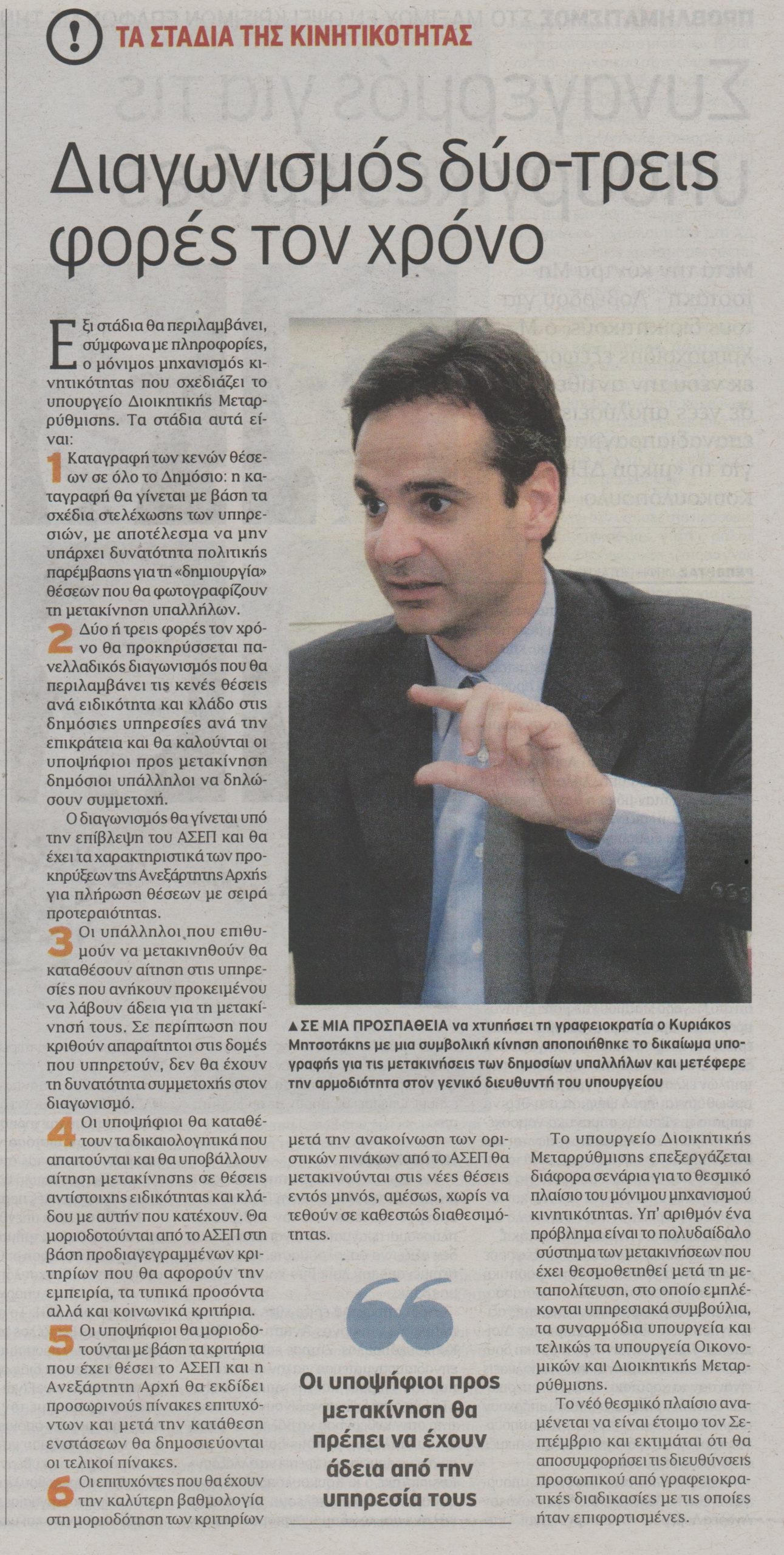 Πράσινο φως για τη διαμόρφωση του μόνιμου μηχανισμού κινητικότητας έδωσε χτες ο υπουργός Διοικητικής Μεταρρύθμισης Κυριάκος Μητσοτάκης με την έκδοση εγκυκλίου στην οποία ζητά από τους γενικούς διευθυντές τη χαρτογράφηση όλων των ειδικών διατάξεων με τις οποίες πραγματοποιούνται αποσπάσεις, μετατάξεις και μετακινήσεις.