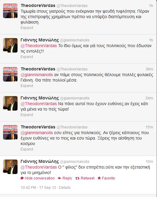 Έντονο διάλογο είχαν μέσω Twitter το στέλεχος των Ανεξάρτητων Ελλήνων και πρώην βουλευτής της ΝΔ Γιάννης Μανώλης με τον στενό φίλο του Αντώνη Σαμαρά, επιχειρηματία Θεόδωρο Βάρδα. Στη συζήτησή μάλιστα, με θέμα τα επιδόματα στους «μαϊμού» τυφλούς έμμεσα μνημονεύεται ως «φίλος» και ο πρωθυπουργός. Ακολουθεί ο διάλογος:Bάρδας: Τιμωρία στους γιατρούς που ενέκριναν την ψευδή τυφλότητα; Πέραν της επιστροφής χρημάτων πρέπει να υπάρξει διαπόμπευση και φυλάκιση.Μανώλης: Το ίδιο όμως και για τους πολιτικούς που έδωσαν τις εντολές!!Bάρδας: Aν πάμε στους πολιτικούς θέλουμε πολλές φυλακές Γιάννη. Θα πάτε πολλοί μέσα.Μανώλης:Να πάνε αυτοί που έχουν ευθύνες, αν έχεις κάτι για μένα να το πεις τώρα!Bάρδας: Εσύ είπες για πολιτικούς. Αν ξέρεις κάποιους που έχουν ευθύνες να το πεις και εσύ τώρα. Ξέρεις την αίσθηση του κόσμουΜανώλης: Ο ” φίλος” δεν επιτρέπει, ούτε καν την εξεταστική για το μνημόνιο!.
