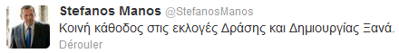 Κοινή κάθοδος στις εκλογές της 17ης Ιουνίου για τη Δράση του Στέφανου Μάνου και τη Δημιουργία Ξανά του Θάνου Τζήμερου.Τα σενάρια για τον πιθανό γάμο των δύο παρατάξεων έδιναν κι έπαιρναν τις τελευταίες ημέρες μετά και τις δηλώσεις του Θάνου Τζήμερου πως το κόμμα του βρίσκεται ιδεολογικά κοντά στη Δράση του Στέφανου Μάνου.Παρότι δεν έχουν υπάρξει επίσημες ανακοινώσεις ο κ. Μάνος επιβεβαίωσε πριν από λίγο μέσω Twitter το γάμο των δύο κομμάτων.ΔΕΙΤΕ ΤΙ ΕΓΡΑΨΕ
