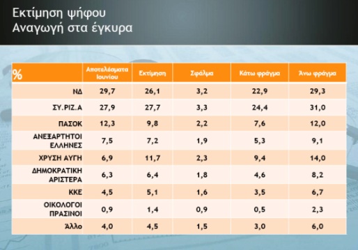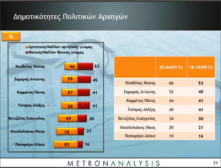 Προβάδισμα στον ΣΥΡΙΖΑ με 1,2 % έναντι της ΝΔ δίνει η δημοσκόπηση της Metron Analysis για την εφημερίδα Επενδυτής.Σύμφωνα με τη δημοσκόπηση, ο ΣΥΡΙΖΑ συγκεντρώνει στην πρόθεση ψήφου 20,8% ενώ η ΝΔ 19,6%.Η Χρυσή Αυγή, αναδεικνύεται σύμφωνα με τη δημοσκόπηση τρίτο κόμμα με 8,8% ενώ το ΠΑΣΟΚ είναι στην τέταρτη θέση με 7,3%.