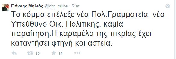 Ο κ. Μηλιός έγραψε, πριν από λίγα λεπτά, στον προσωπικό του λογαριασμό: «Το κόμμα επέλεξε νέα Πολ. Γραμματεία, νέο Υπεύθυνο Οικ. Πολιτικής, καμία παραίτηση. Η καραμέλα της πικρίας έχει καταντήσει φτηνή και αστεία».
