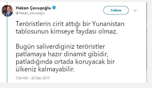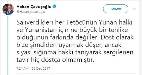 Απειλές της Τουρκίας εναντίον της Ελλάδας, με αφορμή την παροχή ασύλου στον έναν από τους οκτώ Τούρκους αξιωματικούς που κατέφυγαν στην Ελλάδα με ελικόπτερο μετά το πραξικόπημα της 15ης Ιουλίου 2016, εκτόξευσε ο αντιπρόεδρος της Τουρκίας, Χακάν Τσαβούσογλου.Με μηνύματα που ανέβασε στο Twitter, ο συνεργάτης του Ρετζέπ Ταγίπ Ερντογάν αναφέρεται στο θέμα των Τούρκων αξιωματικών, δηλώνοντας χαρακτηριστικά ότι «δεν έχουν αντιληφθεί πόσο μεγάλος κίνδυνος είναι για την Ελλάδα και τον ελληνικό λαό κάθε μέλος της FETÖ που αφήνεται ελεύθερο», προσθέτοντας μεταξύ άλλων πως «δεν ωφελεί κανέναν μια εικόνα της Ελλάδας στην οποία συνωστίζονται οι τρομοκράτες».