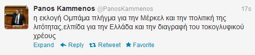 «Πλήγμα για τη Μέρκελ, ελπίδα για την Ελλάδα» γράφει ο Πάνος Καμμένος στο twitter, αναφερόμενος στην επανεκλογή Ομπάμα..