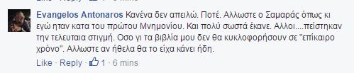 «Κανέναν δεν απειλώ. Ποτέ. Άλλωστε ο Σαμαράς, όπως κι εγώ, ήταν κατά του πρώτου Μνημονίου. Και πολύ σωστά έκανε. Άλλοι…. πείστηκαν την τελευταία στιγμή. Όσο για τα βιβλία μου δεν θα κυκλοφορήσουν σε “επίκαιρο χρόνο”. Άλλωστε αν ήθελα θα το είχα κάνει ήδη».