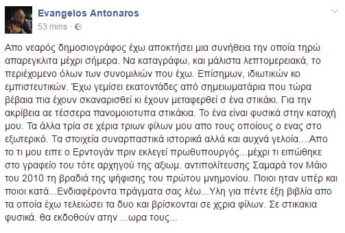 Τα στοιχεία συναρπαστικά, ιστορικά, αλλά και συχνά γελοία… Από το τι μου είπε ο Ερντογάν πριν εκλεγεί πρωθυπουργός… μέχρι τι ειπώθηκε στο γραφείο του τότε αρχηγού της αξιωμ. αντιπολίτευσης Σαμαρά τον Μάιο του 2010 τη βραδιά της ψήφισης του πρώτου Μνημονίου. Ποιοι ήταν υπέρ και ποιοι κατά… Ενδιαφέροντα πράγματα σας λέω… Ύλη για πέντε έξι βιβλία από τα οποία έχω τελειώσει τα δύο και βρίσκονται σε χέρια φίλων. Σε στικάκια φυσικά. θα εκδοθούν στην …ώρα τους…», έγραψε χαρακτηριστικά ο Ευάγγελος Αντώναρος, προαναγγέλλοντας την έκδοση βιβλίων.