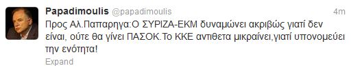 “Προς Αλ. Παπαρήγα:Ο ΣΥΡΙΖΑ-ΕΚΜ δυναμώνει ακριβώς γιατί δεν είναι, ούτε θα γίνει ΠΑΣΟΚ. Το ΚΚΕ αντίθετα μικραίνει, γιατί υπονομεύει την ενότητα!”, έγραψε στο twitter ο Δημήτρης Παπαδημούλης.
