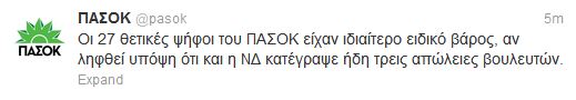Ανάρτηση, στο twitter, με αιχμές για τις απώλειες που κατέγραψε η Νέα Δημοκρατία στην ψηφοφορία για το Μνημόνιο 3, από το ΠΑΣΟΚ…