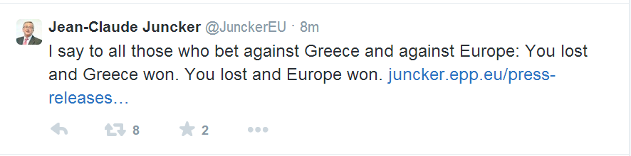 «Λέω σε όλους εκείνους που στοιχηματίζουν κατά της Ελλάδας και της Ευρώπης: Εσείς χάσατε και η Ελλάδα κέρδισε. Εσείς χάσατε και η Ευρώπη κέρδισε» γράφει ο κ. Γιούνκερ στo tweet του.