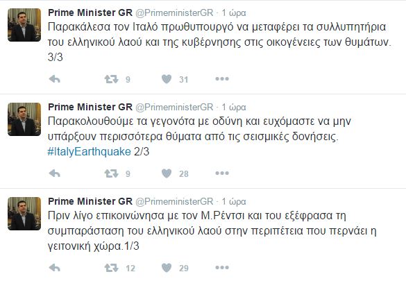 «Πριν λίγο επικοινώνησα με τον Ματέο Ρέντσι και του εξέφρασα τη συμπαράσταση του ελληνικού λαού στην περιπέτεια που περνάει η γειτονική χώρα. Παρακολουθούμε τα γεγονότα με οδύνη και ευχόμαστε να μην υπάρξουν περισσότερα θύματα από τις σεισμικές δονήσεις. Παρακάλεσα τον Ιταλό Πρωθυπουργό να μεταφέρει τα συλλυπητήρια του ελληνικού λαού και της κυβέρνησης στις οικογένειες των θυμάτων».